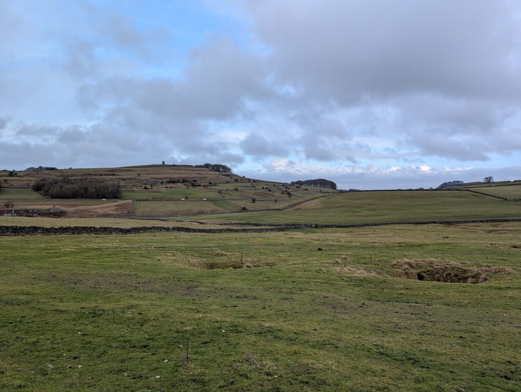 From here, the route starts to climb gently through farmland, with open fields and wide skies. It’s not a steep ascent, just a steady pull that gradually lifts you up above the town. Eventually, the path brings you back out near the crossroads of Grinlow Road, where the walk changes character again.