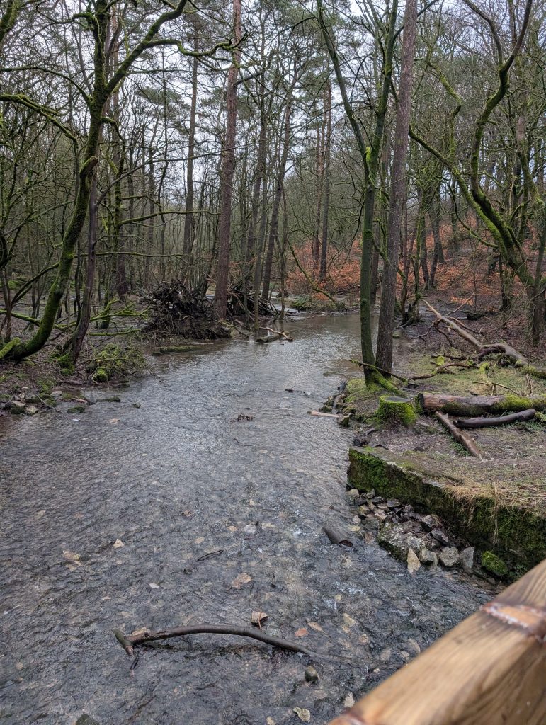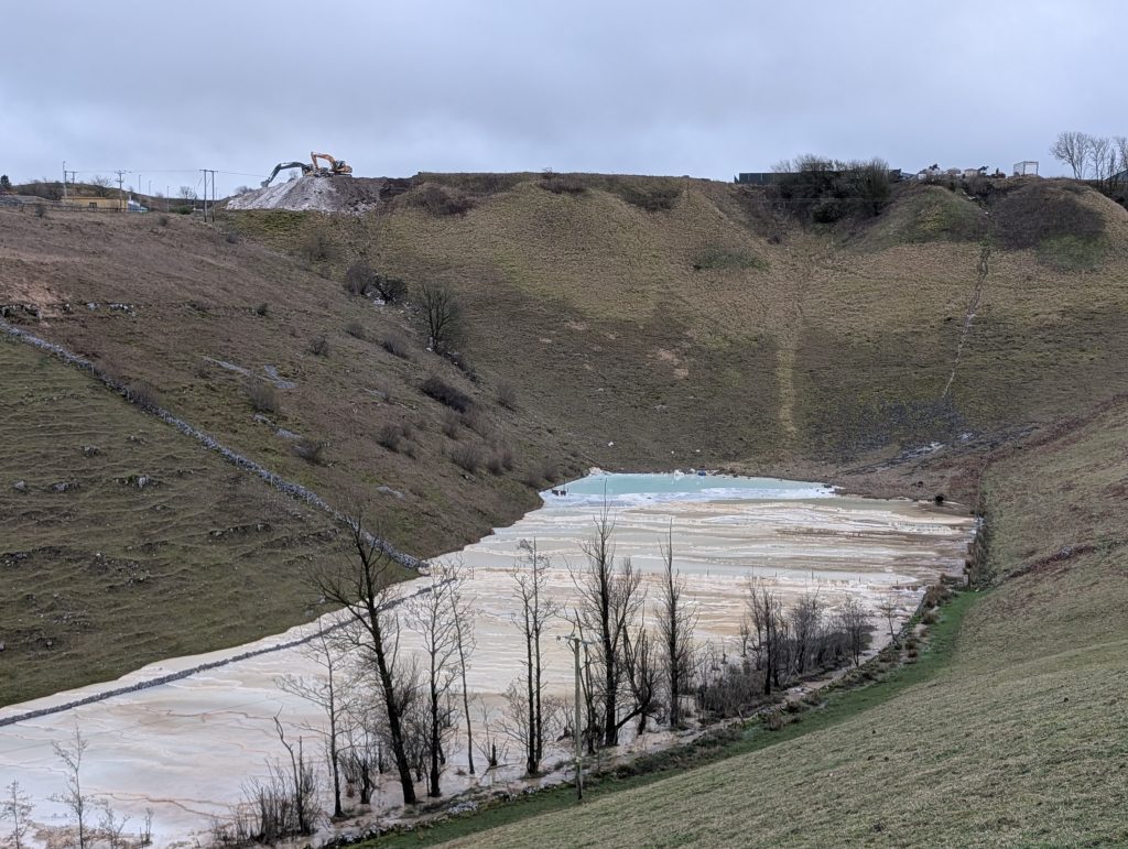Before long, we picked up the public footpath that passes the Tufa Calcite Terraces (above). This is a really interesting little section of the walk and something a bit different from your usual Peak District scenery. The terraces are easy to miss if you’re not looking out for them, but they’re well worth a pause. In the summer, you’ll be treated to turquoise waters which comes from the quarrying that happens in the area.